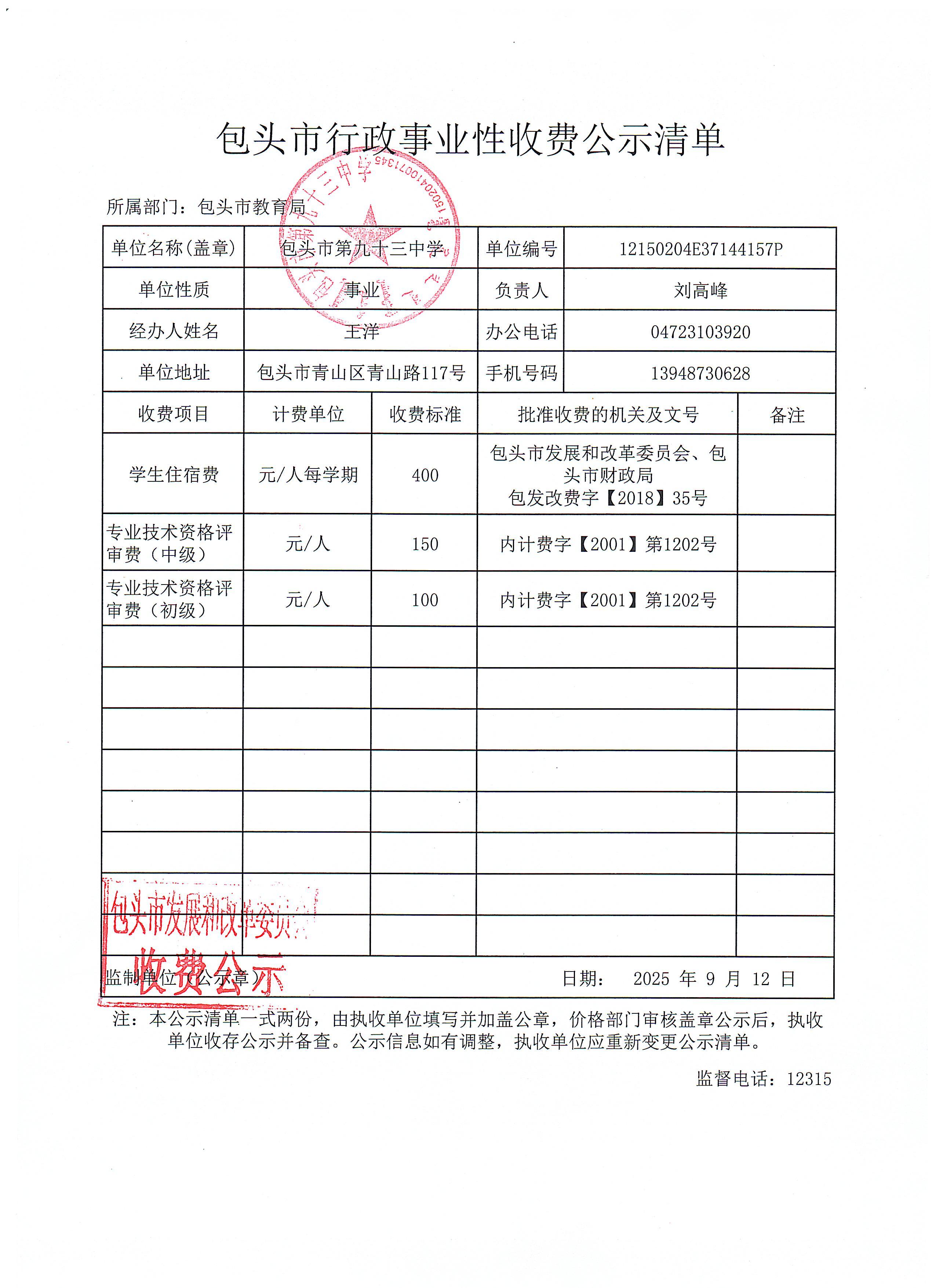 【收费公示】包头市第九十三中学行政事业性收费公示清单