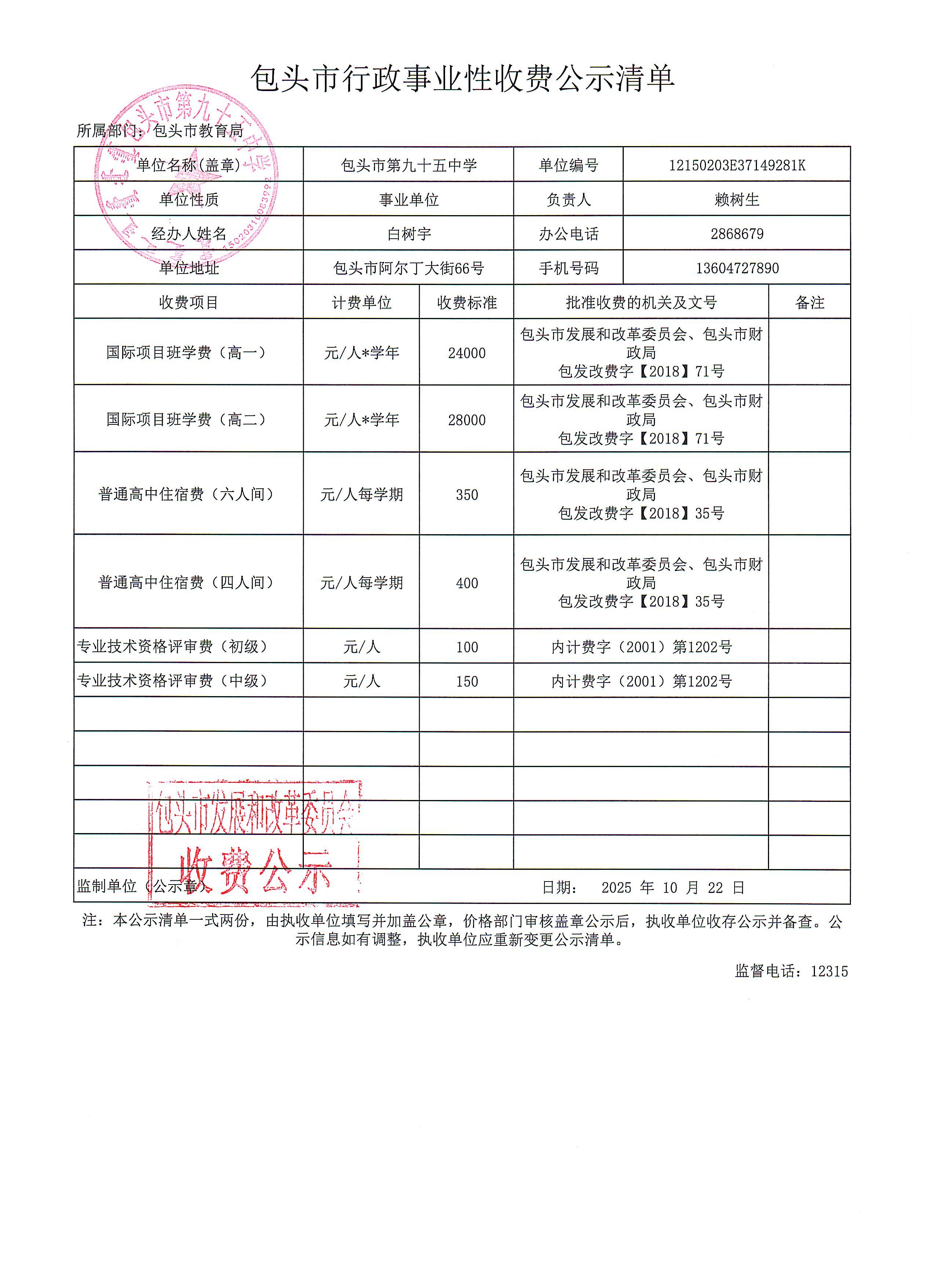 【收费公示】包头市第九十五中学行政事业性收费公示清单